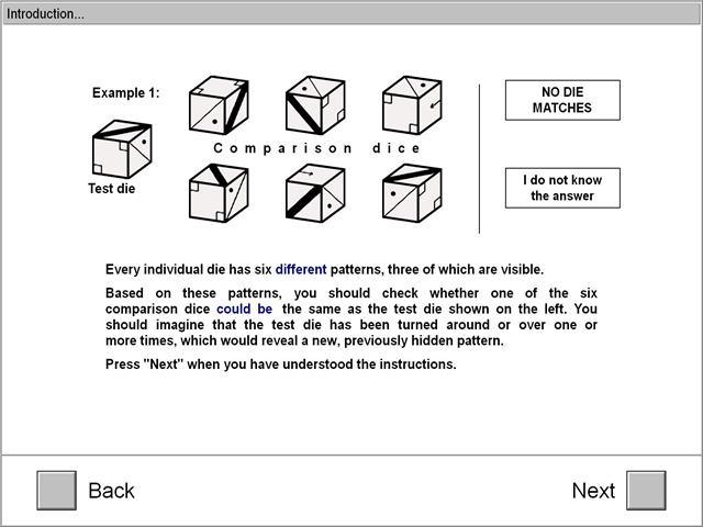 Each item involves a test cube and six comparison cubes. Each cube has different patterns on each of its six sides but only three are visible. Using the patterns that are visible, the respondent must decide whether one of the six comparison cubes is identical to the test cube.